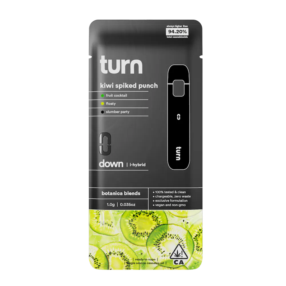 Buzzy, full-bodied, and uplifting, this fruit-forward botanica is smooooooth like Barry White. Settle into a relaxed euphoria and prepare to zone out over a puzzle or get deep into that nature doc you've had queued.  fruit cocktail - floaty - slumber party turn botanica blends You'll only get clean, fresh, guaranteed pure California goodness from seed to pen. Choose from a wide selection of our high potency, exclusive, hand-curated botanica blend formulations to get the perfect floaty feeling you're looking for. // oil highlights // Single source California fresh grown Tested and verified clean Vegan, non-GMO, ultra pure Natural botanical terpenes  turnpen disposables  pack a big punch. With abundant clouds, consistent pulls, and 100% live window view, this pen is practically perfect in every way. No cotton, glue, or heavy metals - ever. Free and easy airflow, 1.0 ml oil capacity, USB-C rechargeable, 150 puffs per charge, 1-year disposable, LED display, and clearview window so you never miss a drop. Powerful to the last puff, clean, convenient, pocket-comfy, with no buttons, no BS.